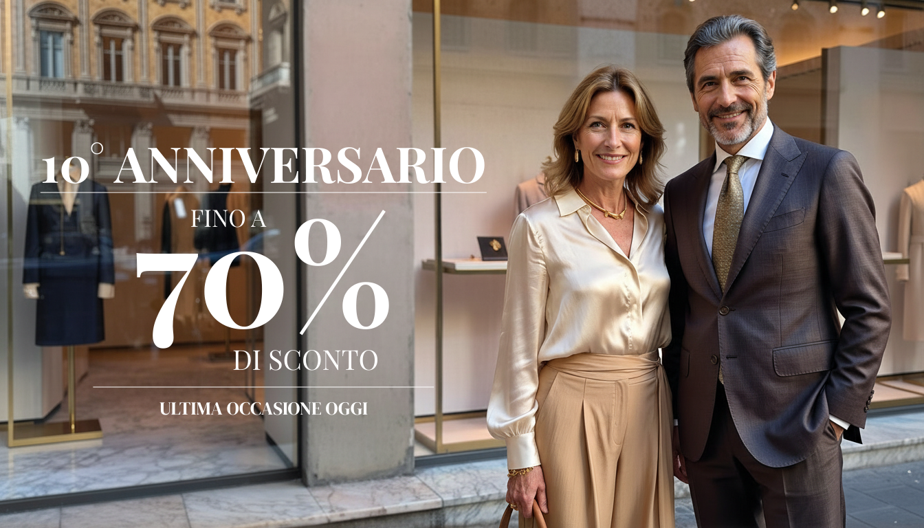 Da 10 anni offriamo stile e qualità in tutta Italia. Per festeggiare, oggi solo per voi: Saldi Anniversario con sconti esclusivi e crescenti — più acquistate, più risparmiate. Solo per oggi.